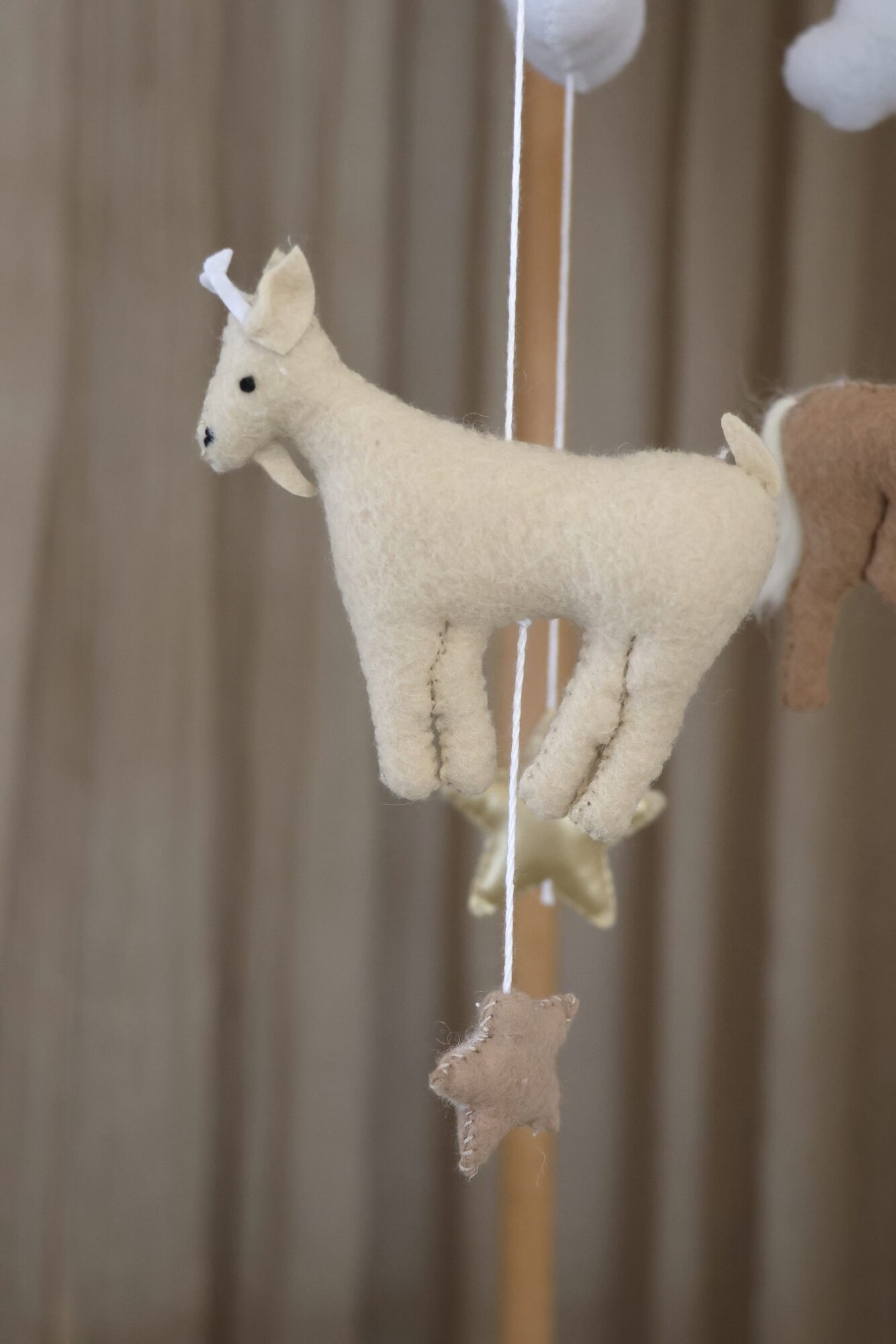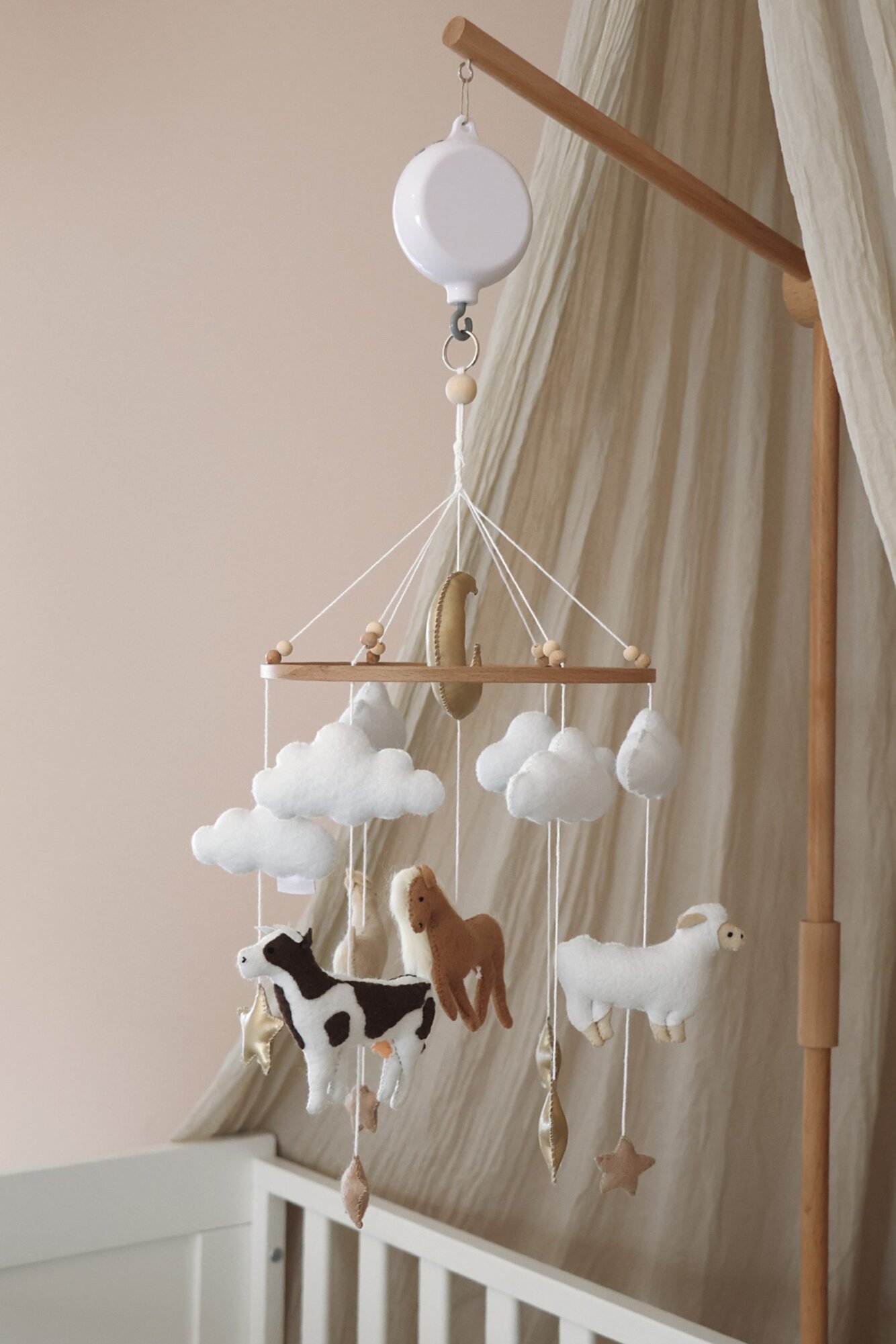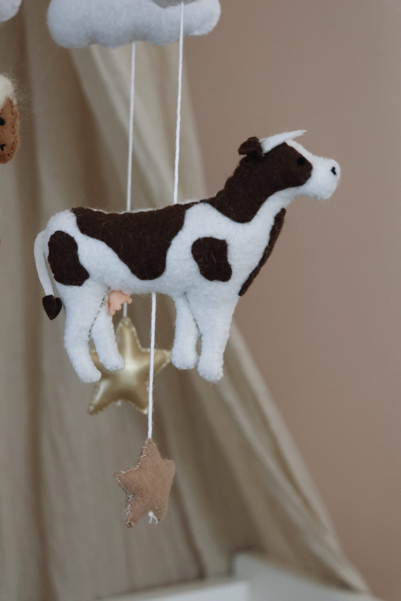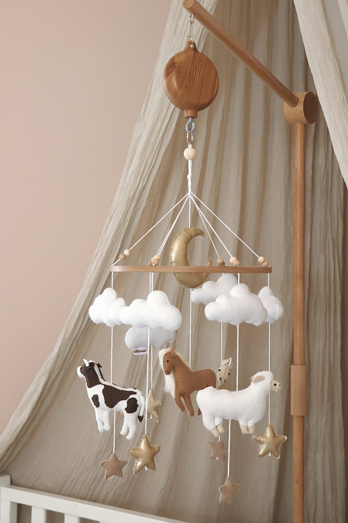 De koeien babymobiel van Little Loua brengt een speelse en rustgevende sfeer in de babykamer. Schattige boerderijdieren, waaronder koeien, hangen aan een houten ring en wiegen zachtjes boven het bedje, waardoor een kalme en dromerige omgeving ontstaat.