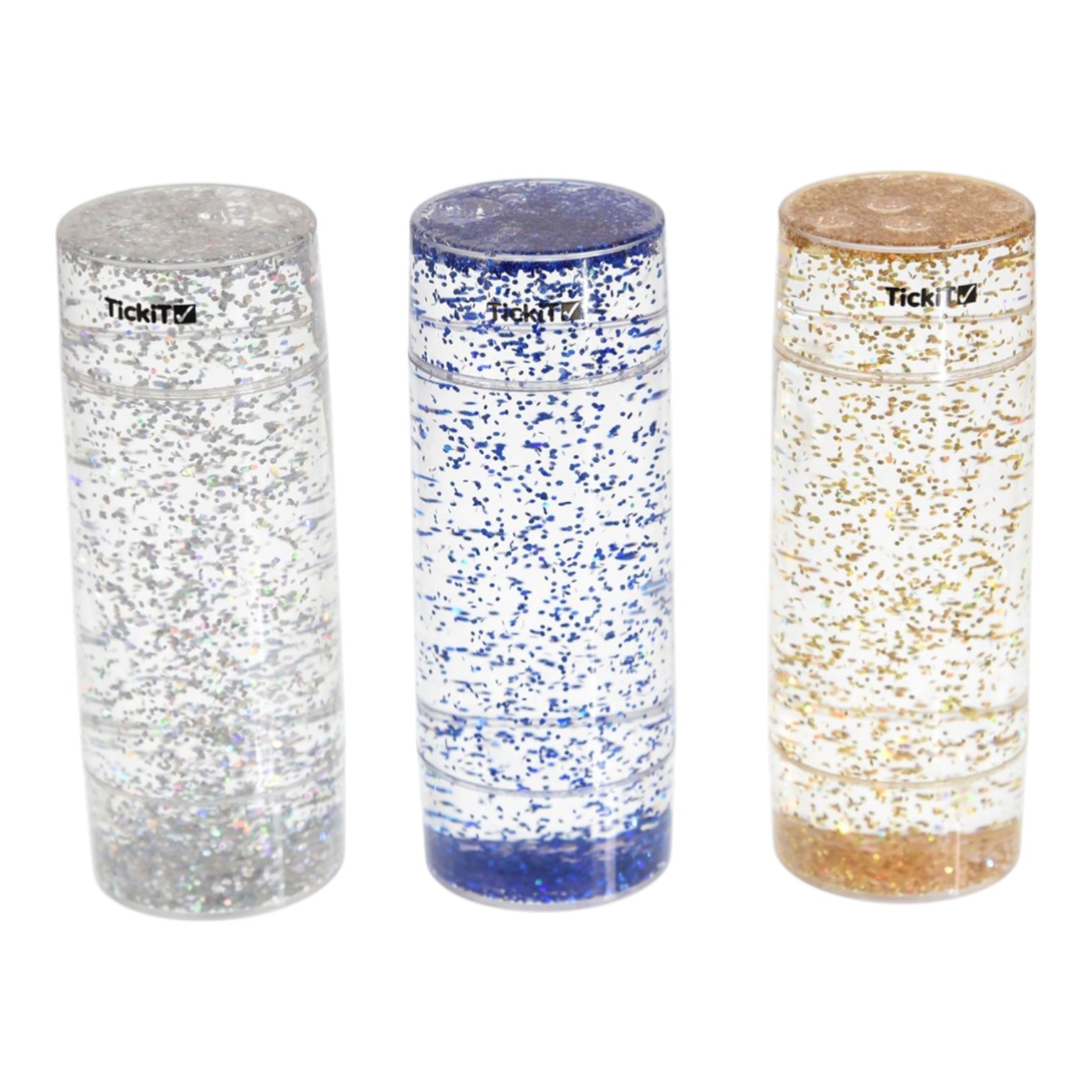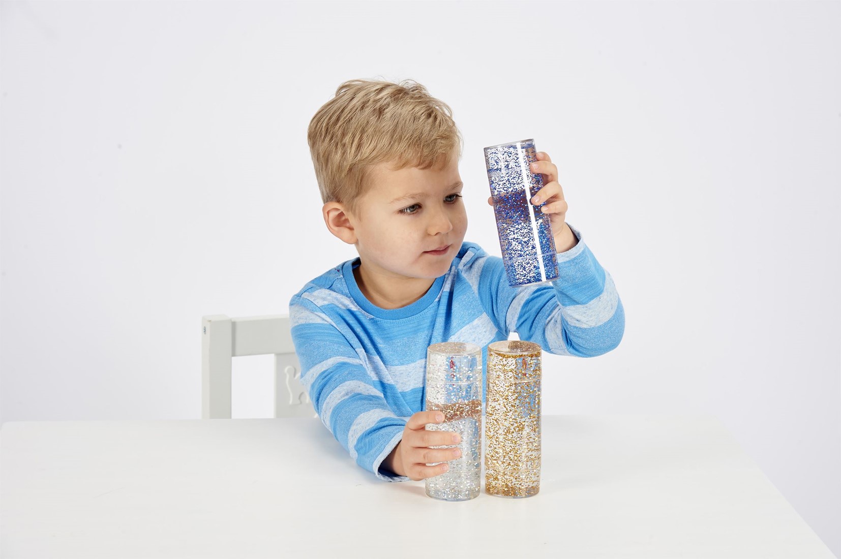 Voeg magie toe aan zintuiglijk spel met de tickit® Zintuiglijke Glitterstormset. Deze set bestaat uit drie kristalheldere, cilindervormige shakers gevuld met een veilige, niet-giftige vloeistof op glycerolbasis en bruisend water. Even schudden en er ontstaat een betoverende glitterstorm die langzaam neerdaalt en prachtig fonkelt – perfect om de aandacht en focus van je kind vast te houden.