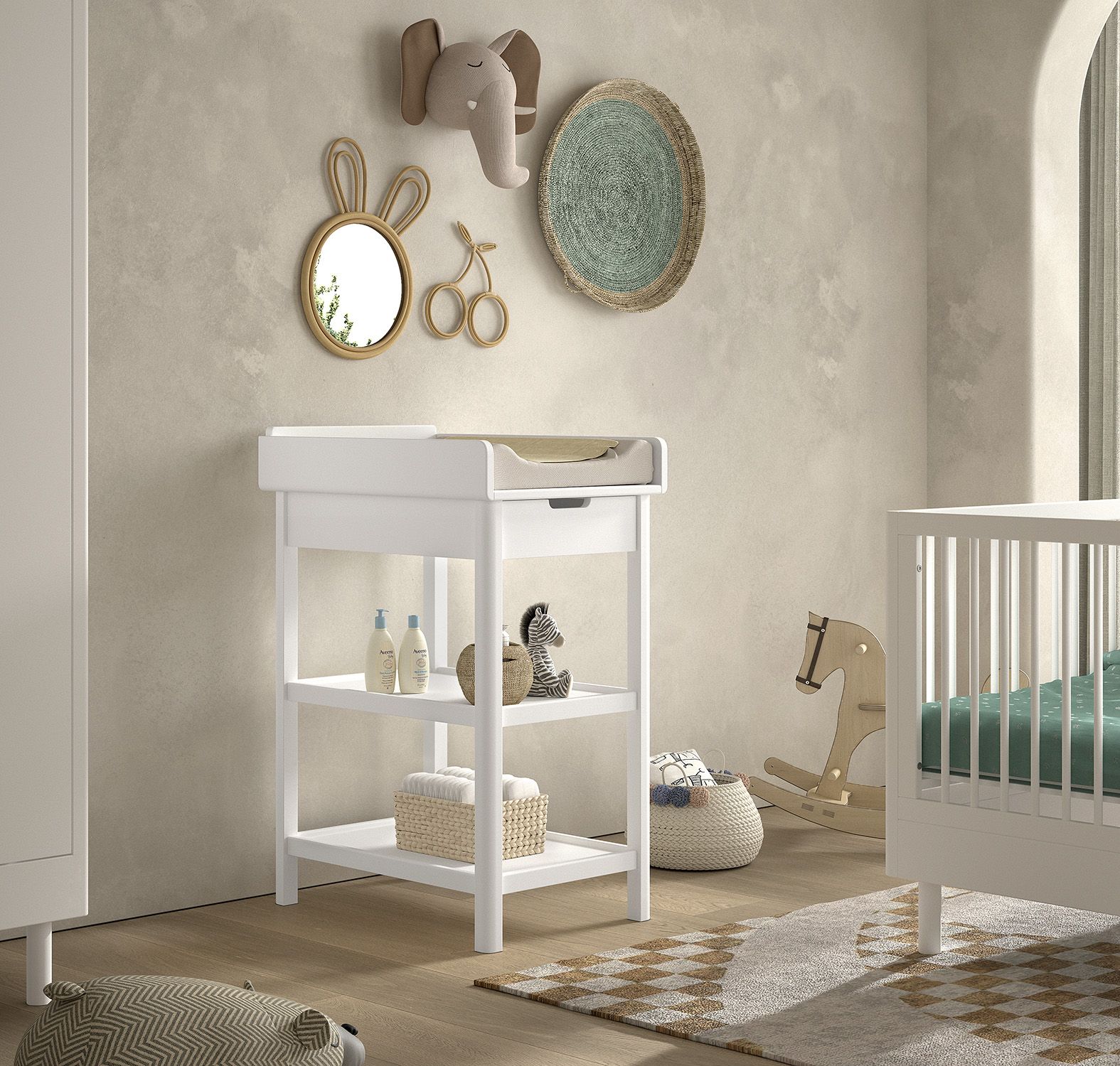 De luiertafel biedt een veilige plek om je baby te verzorgen en te verschonen dankzij de opstaande randen. Met twee open legplanken en een ruime lade is er voldoende ruimte voor het opbergen van luiers, doekjes, kleding en andere essentiële items. De FORREST collectie is ontworpen met oog voor detail en straalt kwaliteit, functionaliteit en tijdloze elegantie uit.
