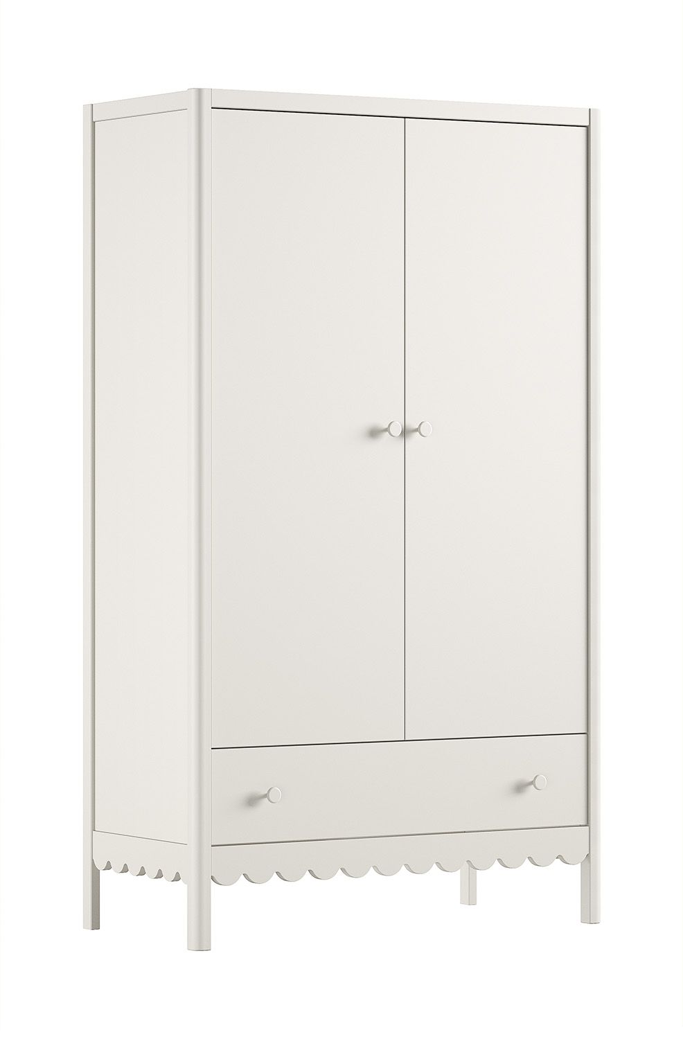De kast biedt volop ruimte voor het netjes opbergen van kleertjes, accessoires en andere benodigdheden. Onderaan bevindt zich een ruime lade, ideaal voor dekentjes, luiers of speelgoed. De subtiele decoratieve golfrand aan de onderzijde geeft het geheel een speels en verfijnd accent.