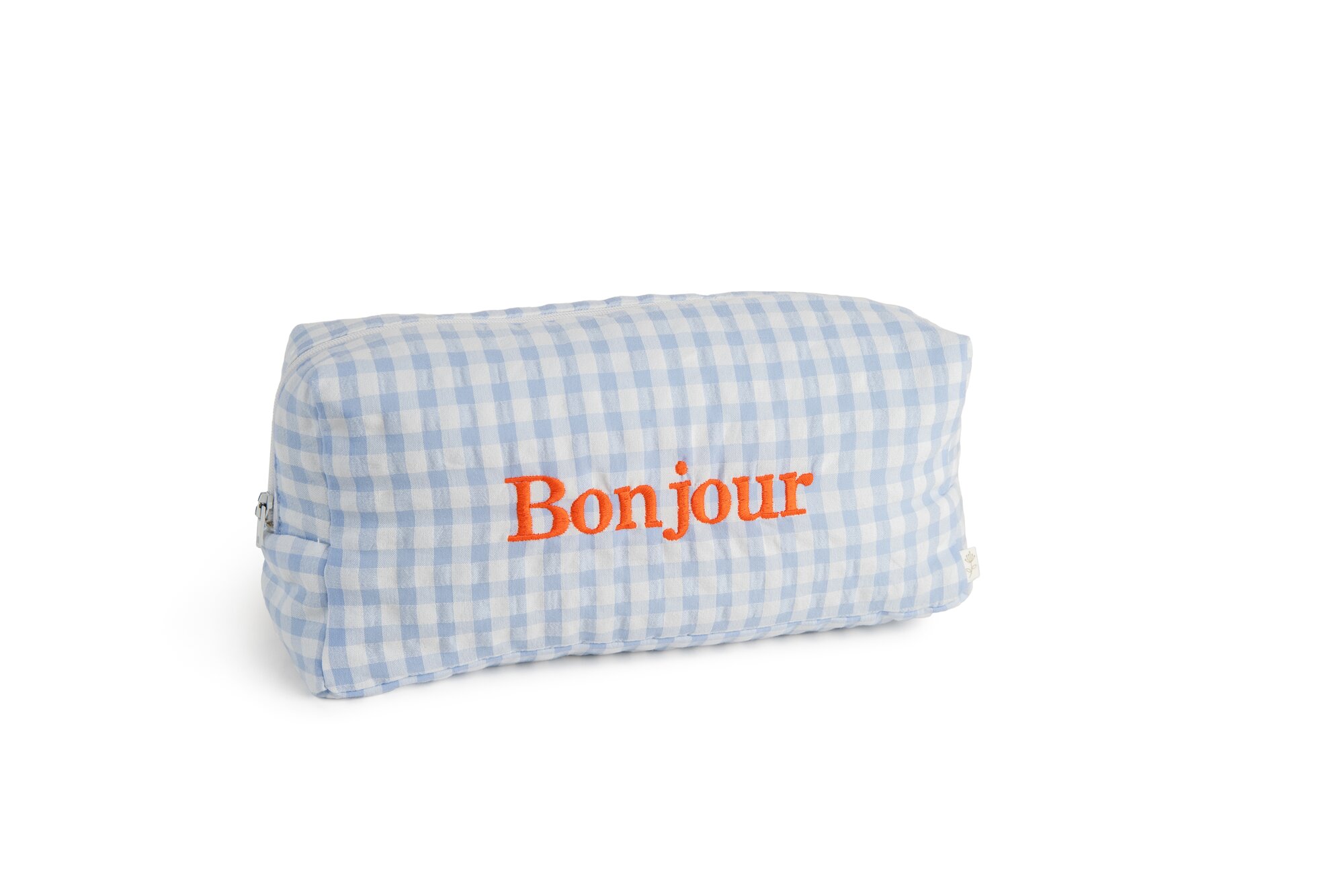 Stijlvolle en praktische toilettas in blauwe vichy, perfect om je dag fris en georganiseerd te starten. De tas is afgewerkt met een fluo oranje borduring ''Bonjour'', wat zorgt voor een vrolijke en energieke uitstraling.