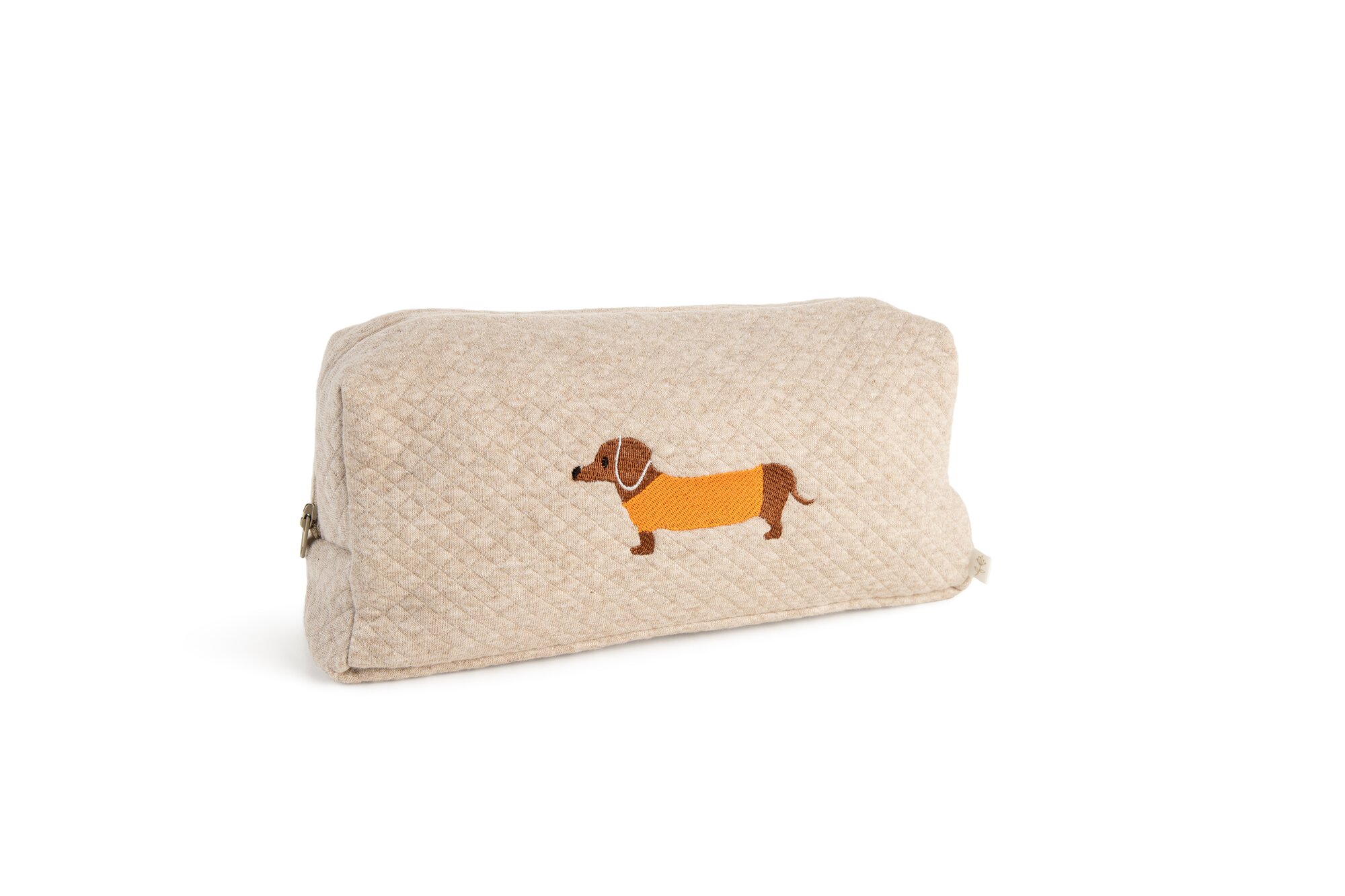 Leuke en praktische toilettas in doorstikte stof met losange patroon in beige/camel, ideaal om alle verzorgingsspulletjes netjes te bewaren. De tas is prachtig afgewerkt met een fijne borduring van Teckel Max, wat zorgt voor een speelse en stijlvolle uitstraling.