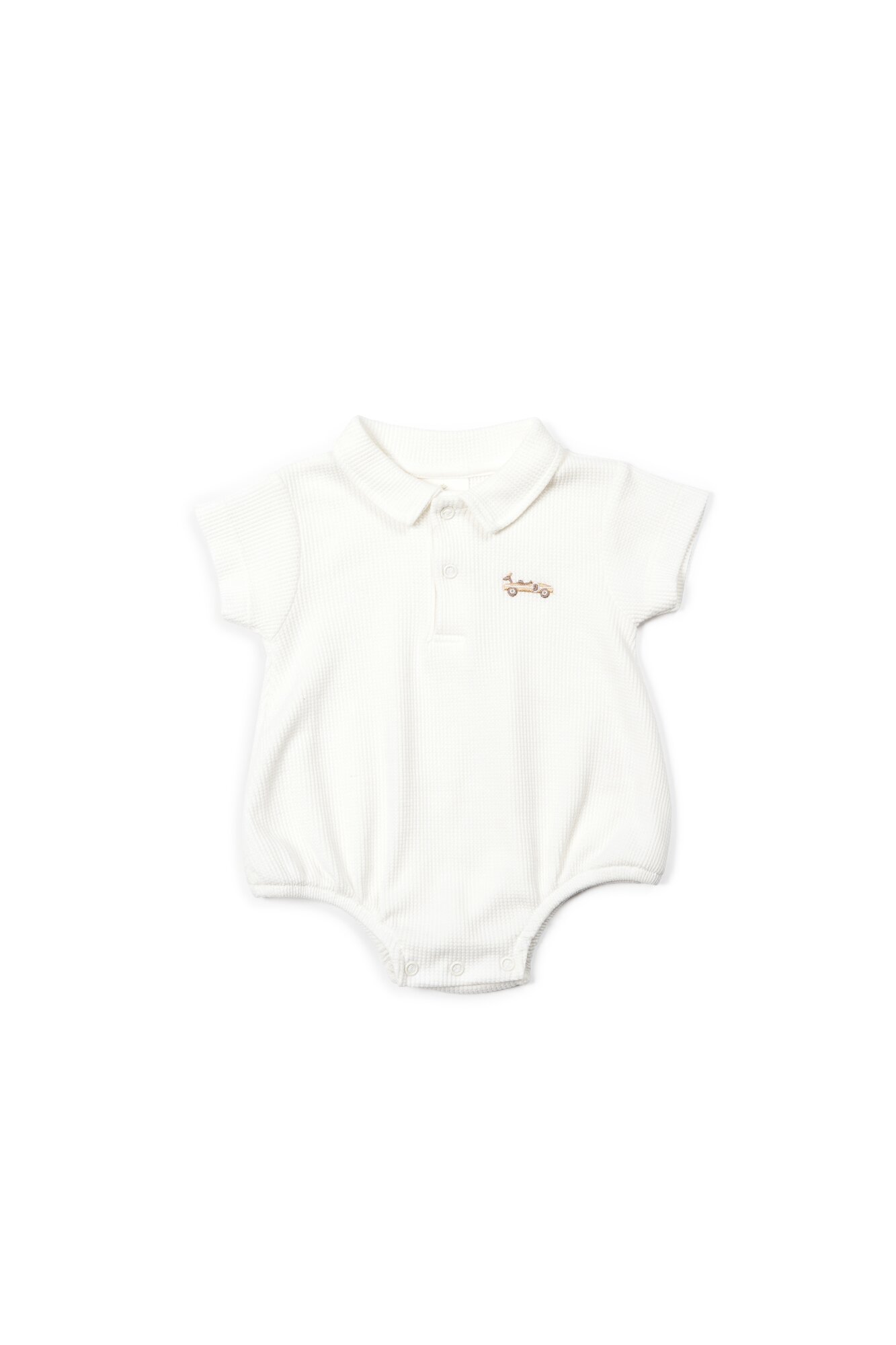 Tijdloze en stijlvolle babyromper Ralph in ecru, ideaal voor jongens tijdens warme dagen. Gemaakt van een ademende gewafelde katoenmix die zorgt voor optimaal comfort en een luxueuze uitstraling. Perfect voor vakanties, stranddagen of een ontspannen middag aan het zwembad.
