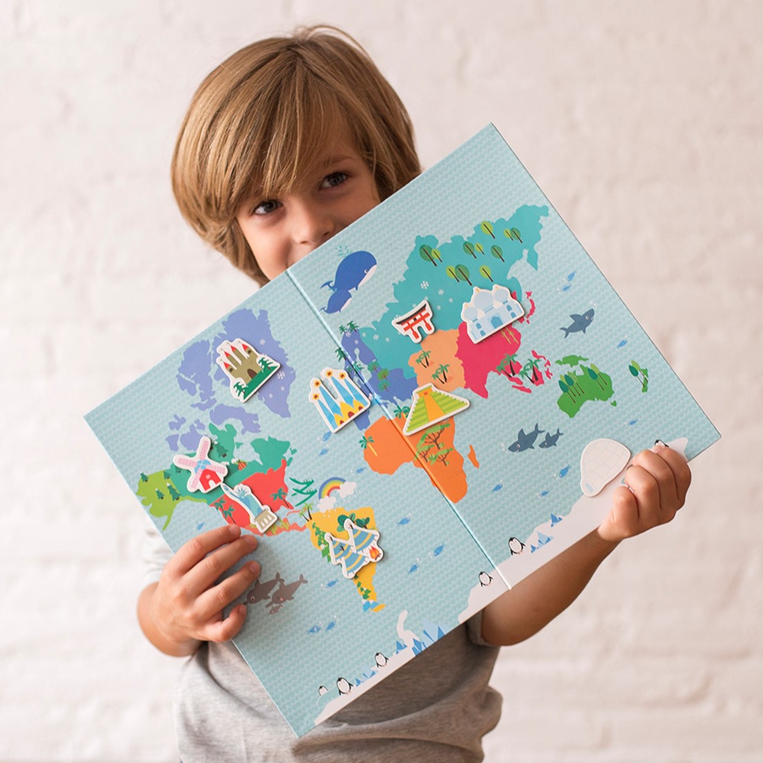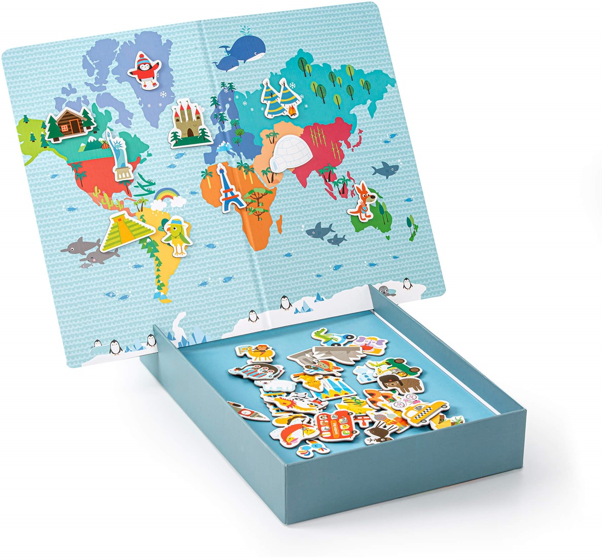 Magnetisch wereldkaart spel kopen? Dit educatieve spel laat kinderen spelenderwijs de wereld ontdekken door monumenten en dieren op de juiste plek te plaatsen. Met 40 kleurrijke magneten en een handig opvouwbaar speelbord (36 x 28 cm) stimuleert het de nieuwsgierigheid en het leerplezier.