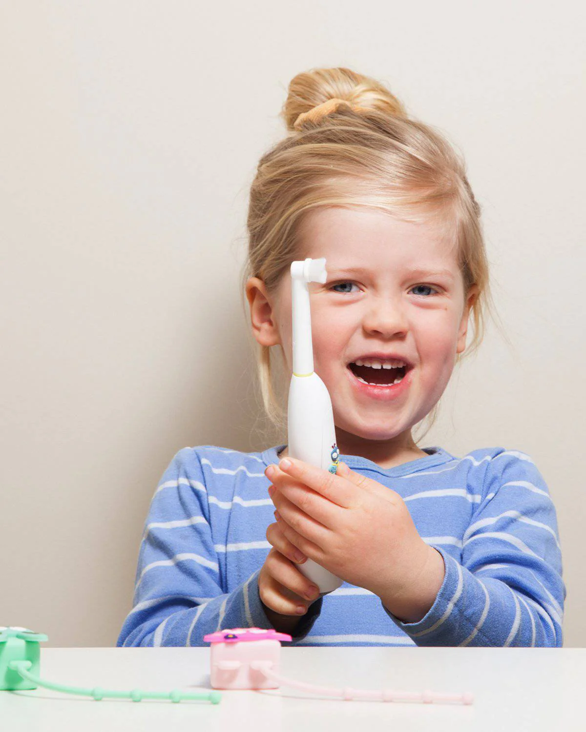 Het draaiende ontwerp met zachte vibraties, vervangbare borstelkoppen en driekleurige LED-indicator maakt tandenpoetsen leuk en eenvoudig. Waterbestendig, met kindveilig batterijcompartiment en een op maat gemaakte siliconen buzz-knop. Inclusief 6 glow-in-the-dark bubbelstickers om de borstel persoonlijk te maken. Geschikt voor kinderen vanaf 3 jaar.