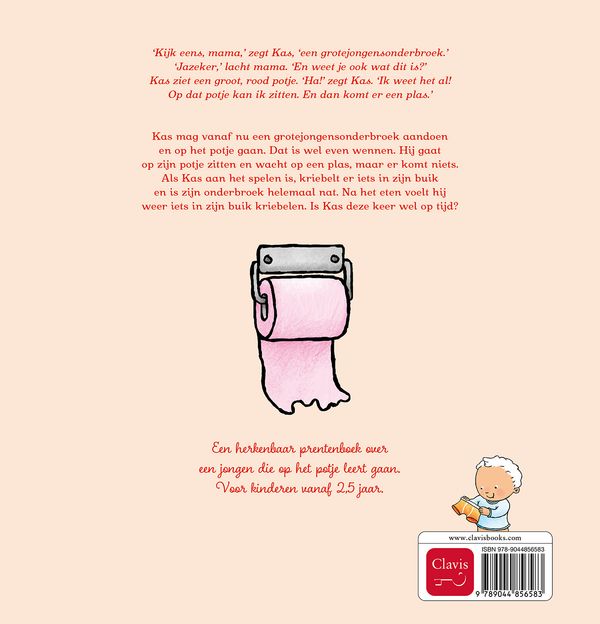 'Kijk eens, mama,' zegt Kas, 'een grotejongensonderbroek.' 'Jazeker,' lacht mama. 'En weet je ook wat dit is?' Kas ziet een groot, rood potje. 'Ha!' zegt Kas. 'Ik weet het al! Op dat potje kan ik zitten. En dan komt er een plas.' Kas mag vanaf nu een grotejongensonderbroek aandoen en op het potje gaan. Dat is wel even wennen. Hij gaat op zijn potje zitten en wacht op een plas, maar er komt niets. Als Kas aan het spelen is, kriebelt er iets in zijn buik en is zijn onderbroek helemaal nat. Na het eten voelt hij weer iets in zijn buik kriebelen. Is Kas deze keer wel op tijd? Een herkenbaar prentenboek over een jongen die op het potje leert gaan. Voor kinderen vanaf 2,5 jaar.