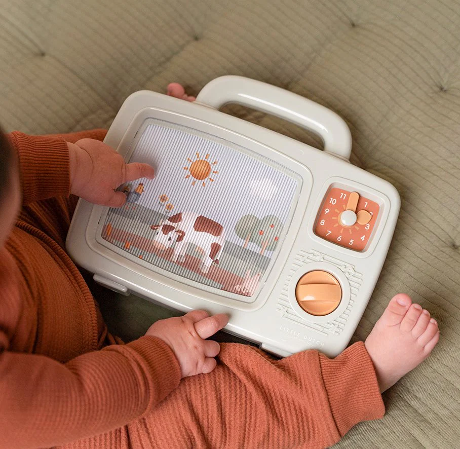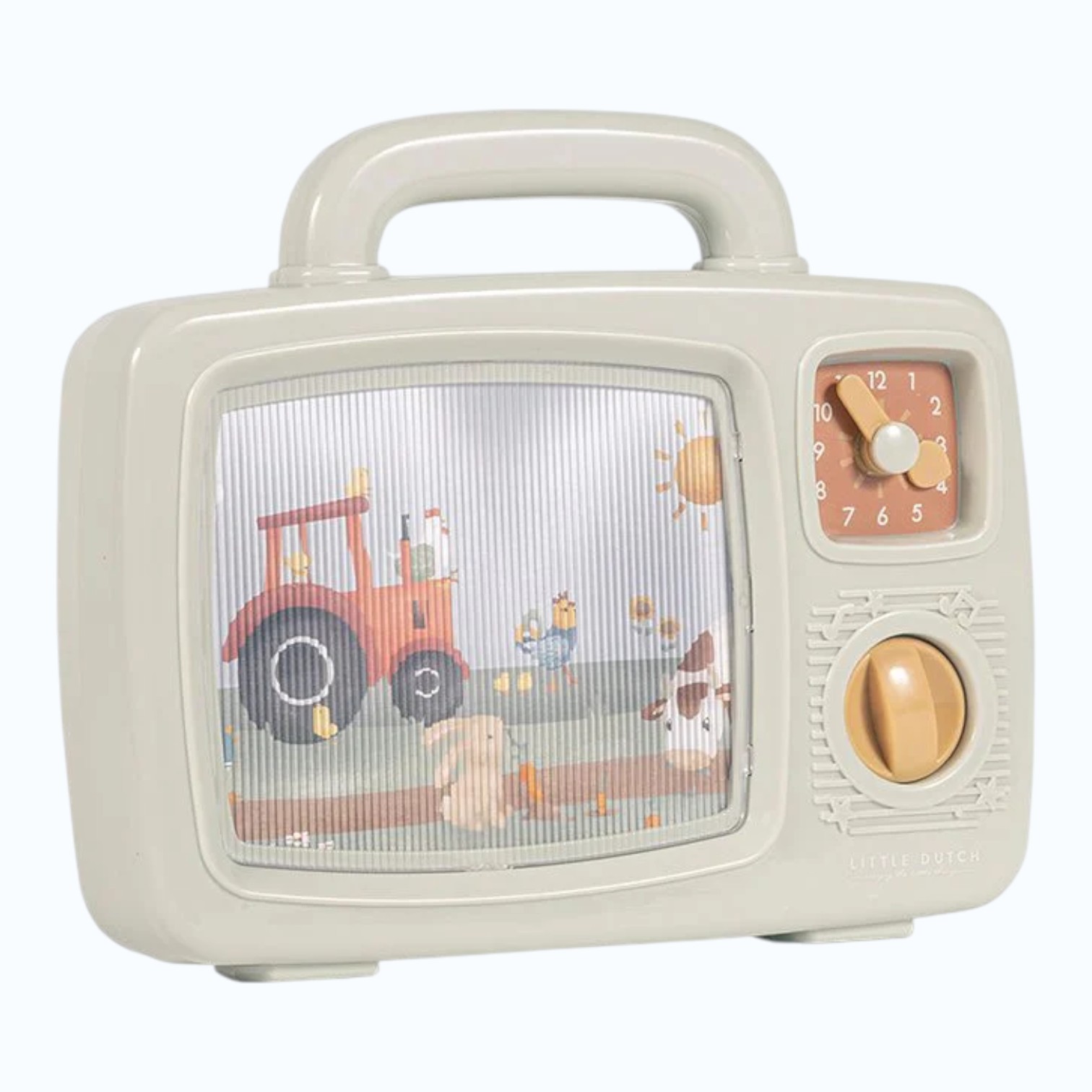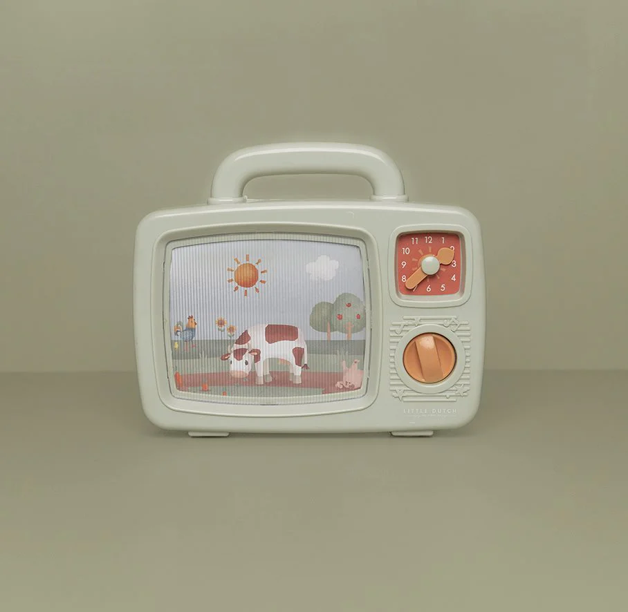 De Little Dutch Little Farm Muziek TV is een vrolijke muziekdoos met een bewegende animatie die kinderen blijft fascineren. Draai aan de knop en luister naar een gezellig muziekje terwijl de schattige boerderijdieren over het televisiescherm bewegen. Dankzij het handige handvat neem je deze leuke muziekdoos eenvoudig overal mee naartoe. Perfect als speels en decoratief item in de kinderkamer.