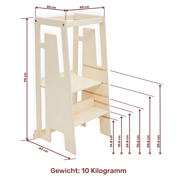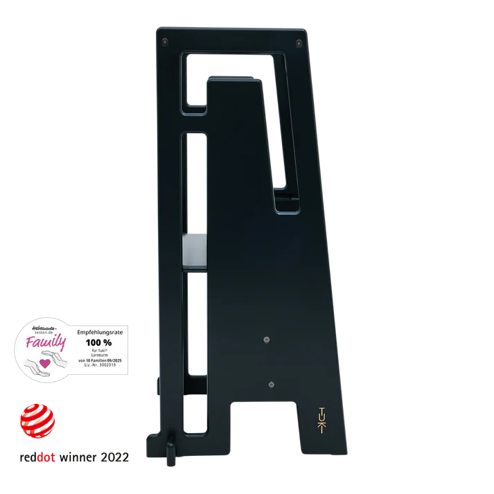 De Tuki leertoren is stabiel. Dankzij de hoogteverstelling blijft het zwaartepunt laag. Daarnaast zorgt de intelligente voet aan de zijkant van de Tuki voor extra beveiliging. De Tuki kan tot 100kg beladen worden en draagt dus ook volwassenen. De Tuki is door TÜV officieel getest.